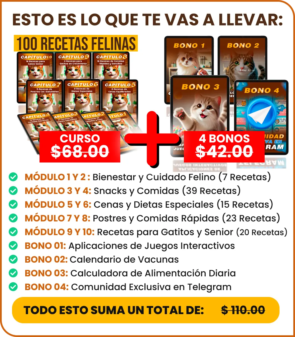 - Deseas aprender a preparar comidas caseras adaptadas a tu gato, ya sea en crecimiento o senior.