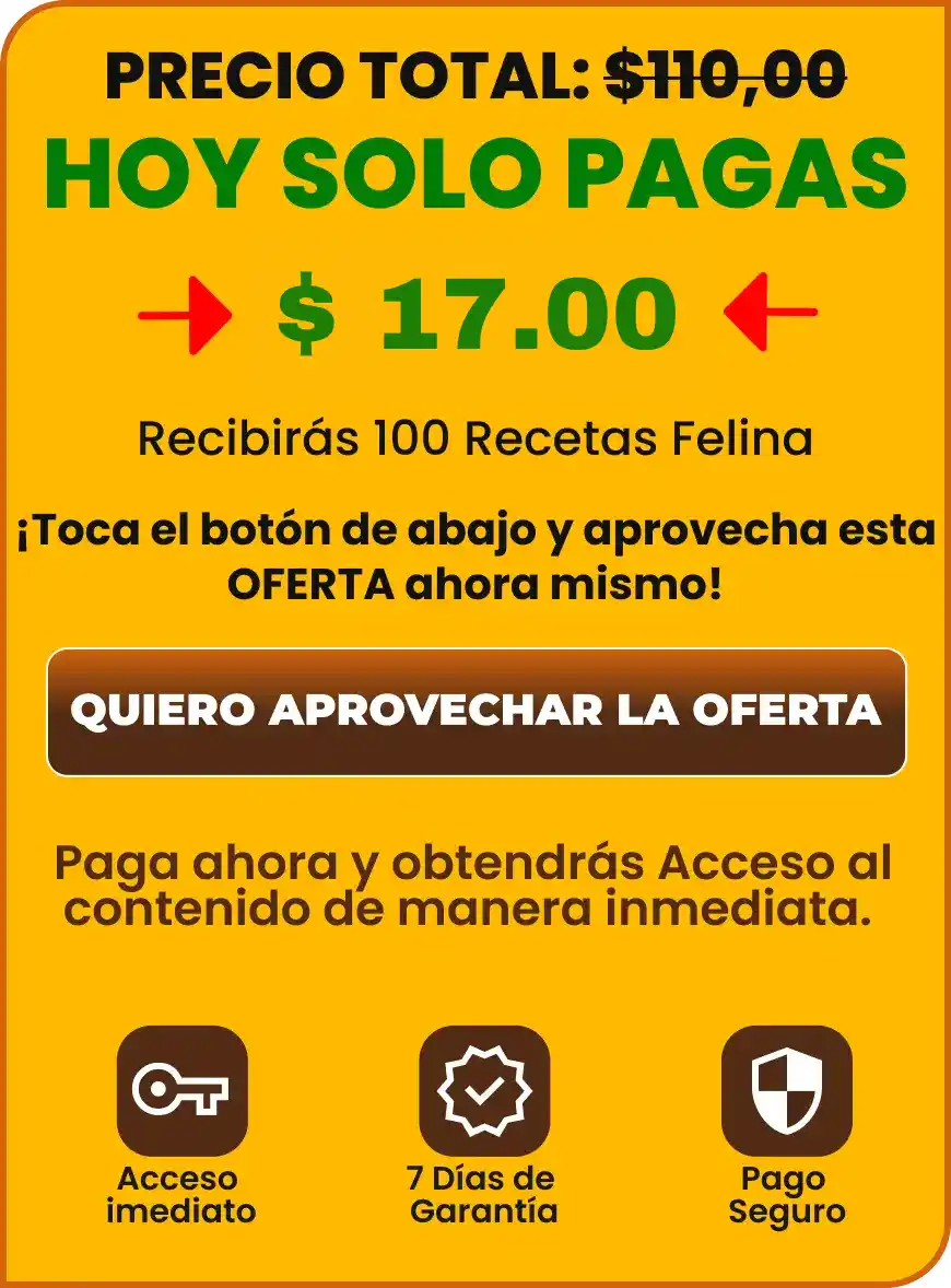 Aprovecha mi garantía 100% incondicional de 7 días para que pruebes el producto de MENÚ GATUNO y prueba si funciona para tu amigo felino. Si dentro de los 7 días posteriores a la compra del producto, no estás satisfecho, simplemente ponte en contacto, solicita cancelación y reembolso y obtendrás la devolución de todo tu dinero. Nosotros no te haremos ningún tipo de pregunta.